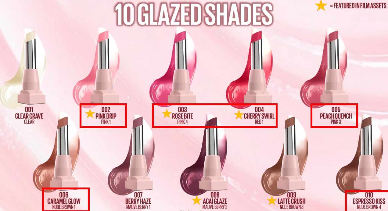 | Shades | 002 Pink Drip, 003 Rose Bite, 004 Cherry Swirl, 005 Peach Quenchy, 006 Caramel Glow, 010 Espresso Kiss |